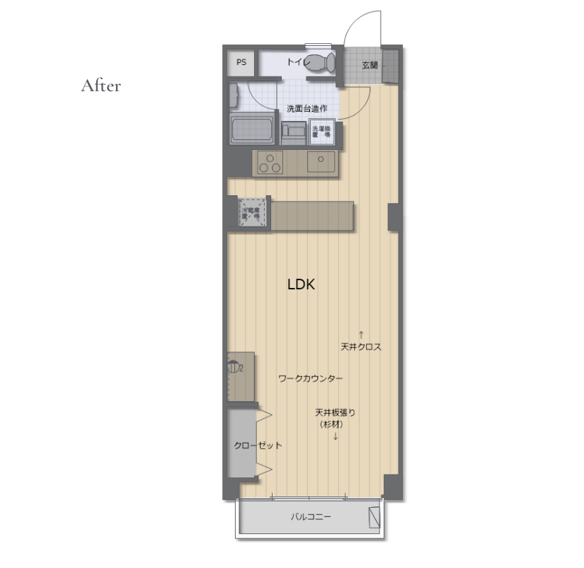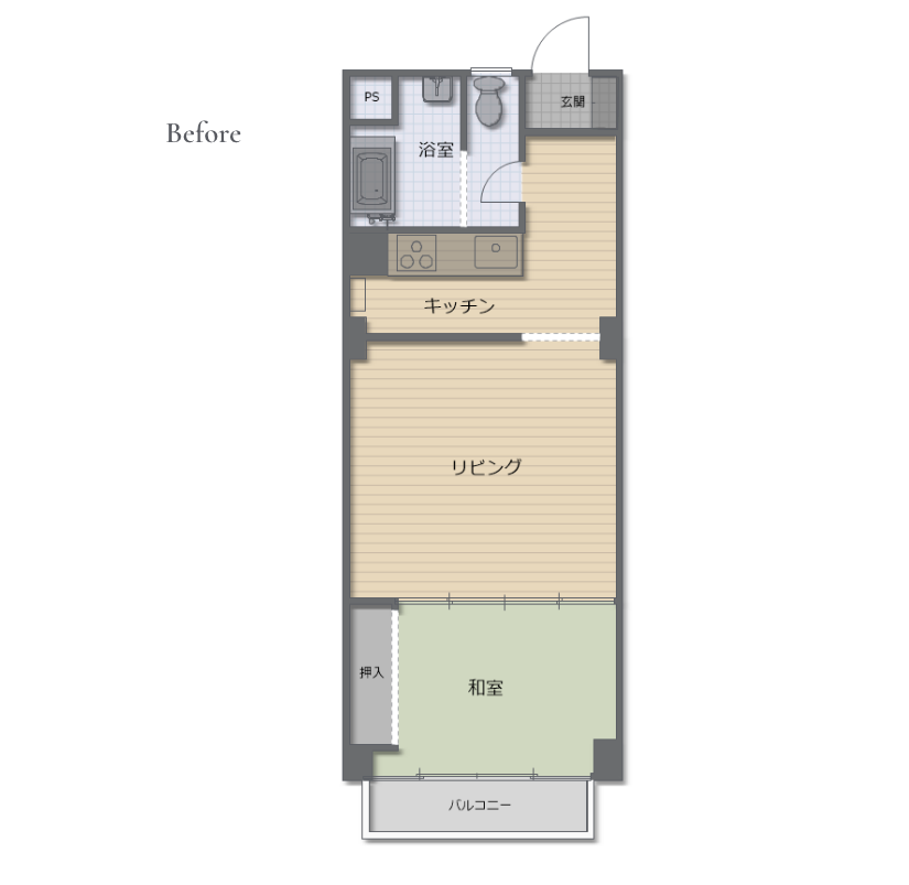 - 2Kから1LDKへ間取りを変更し、現代の生活様式に適した開放的な空間を創出